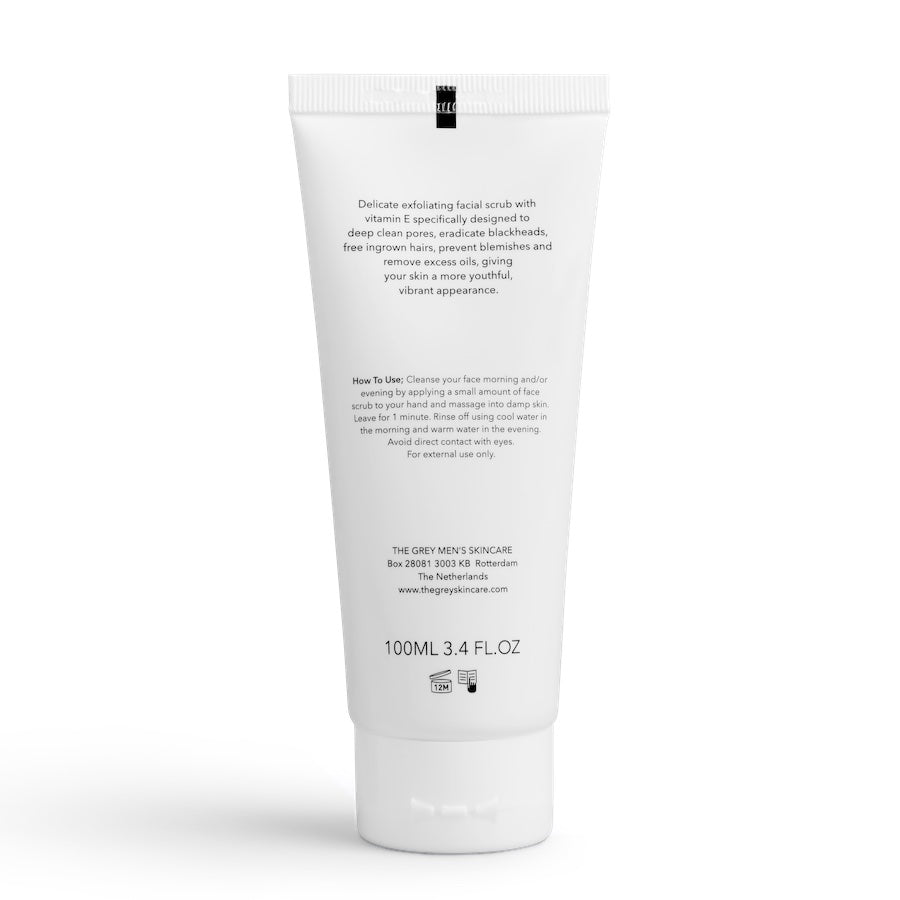 Delicate exfoliating facial scrub withVitamin E and Vitamin A, specifically designed to deep clean pores, eradicate blackheads, free ingrown hairs, prevent blemishes and remove excess oil, giving your skin a more youthful, vibrant appearance.